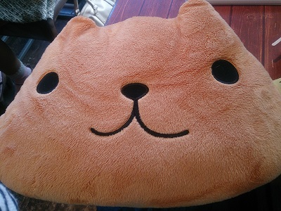 カピバラさんクッション。カピバラさんの帽子もありました♪店内はカピバラさんだらけ。後、物販コーナーもあり、カピバラさんのクッキーやポストカード、タオルなどもあります。和む~。
