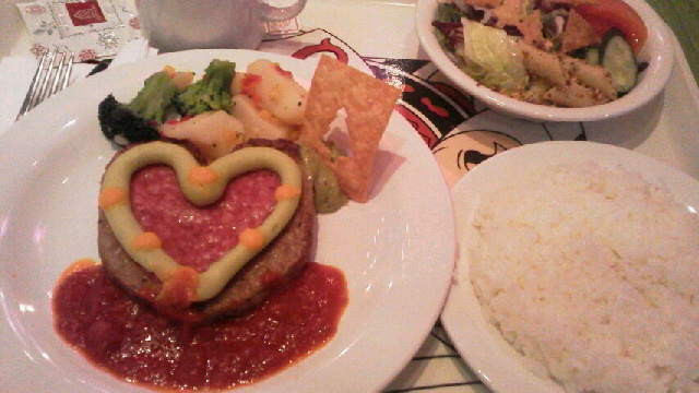 で、ハンバーグを頼みました~。ハートがかわいい♪それなりに美味しかったです。だけどやっぱりディズニーは高くつきますね(^^;)
