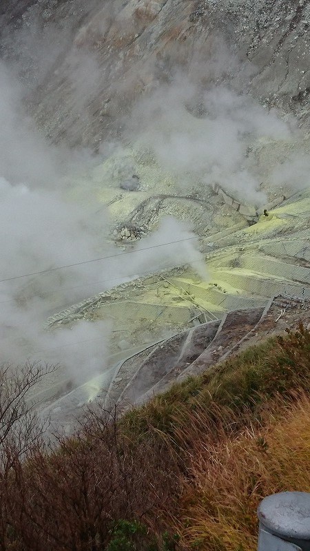 大涌谷へ。黒たまごは食べてこなかったですが、噴火した後とか見られますね。煙とイオウの臭いが凄いです。(特にロープウェイでのイオウの臭いヤバイ)